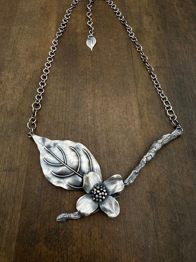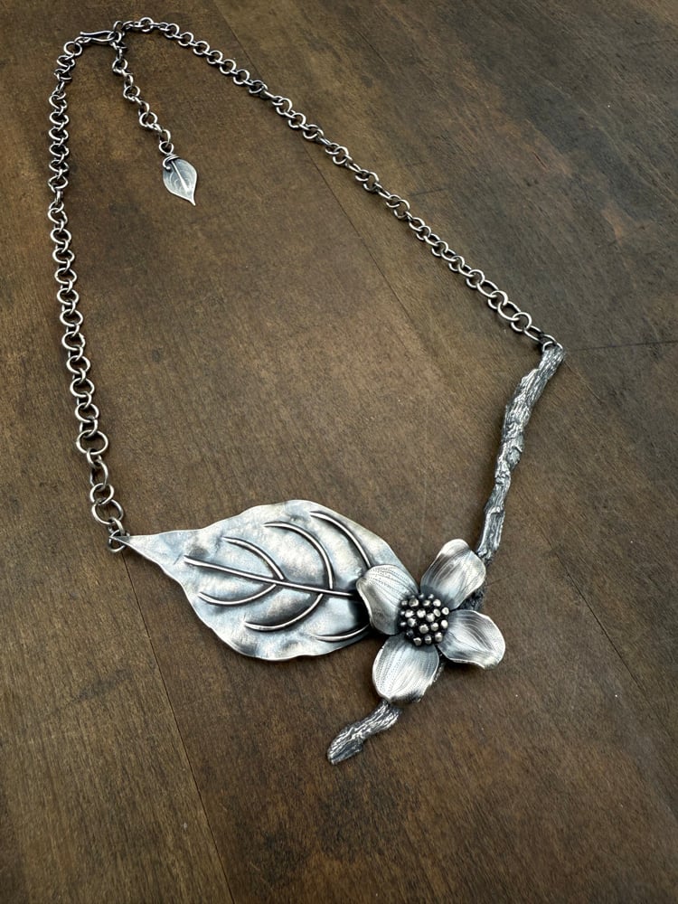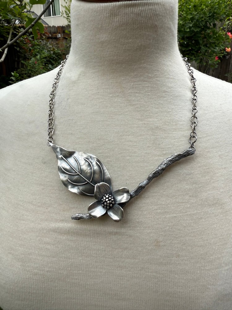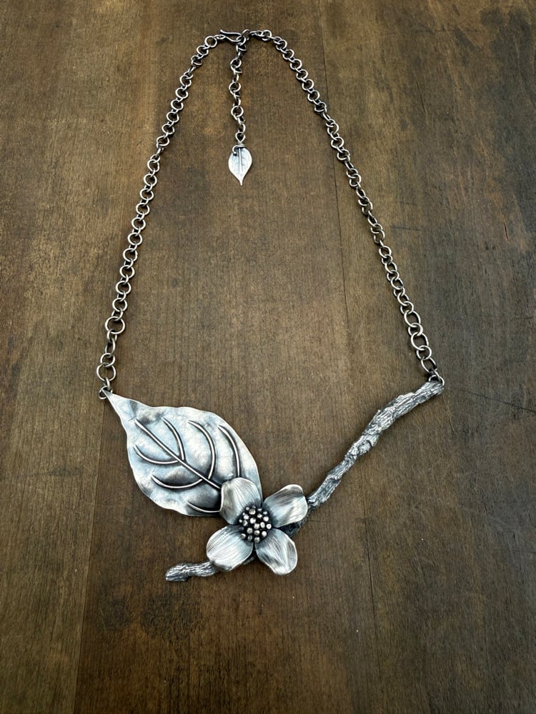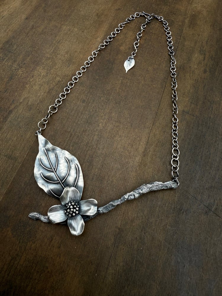 Enamored with this dogwood flower, which resembles the languid nature of its real counterpart. The leaf, which has been a vexing part of my dogwood pieces for years, turned out beautifully (and this is quite surprising in this heavy gauge silver!). The branch is fused metal, highly textured for impact.