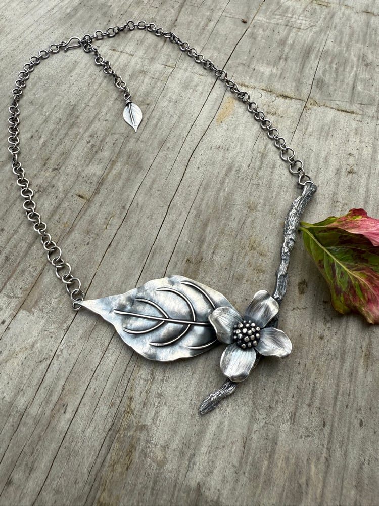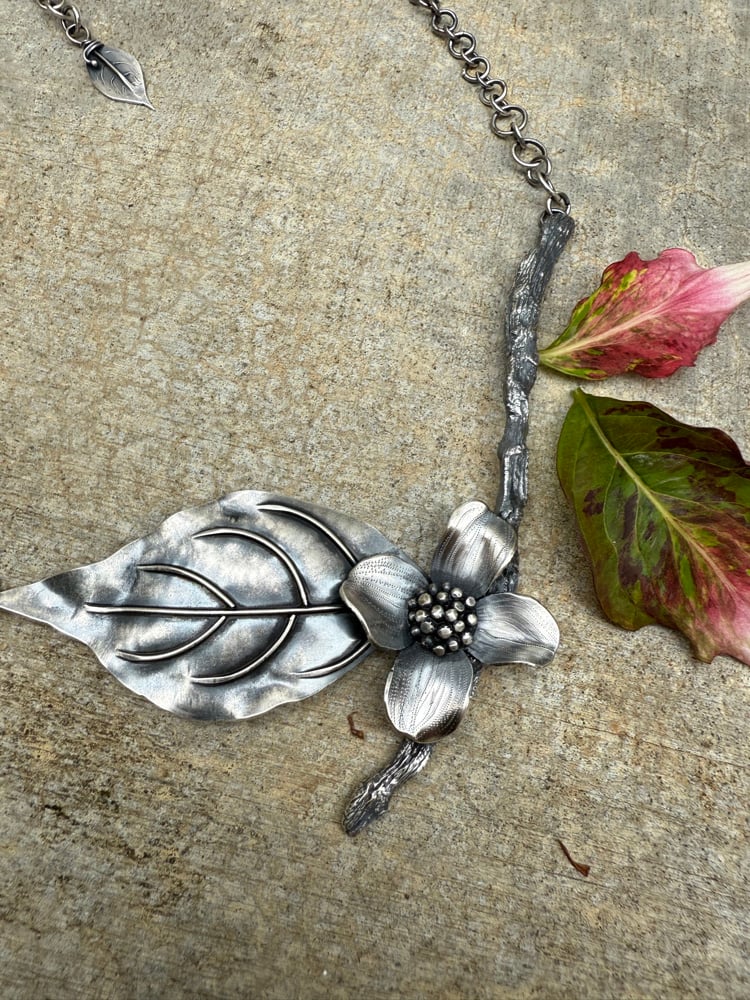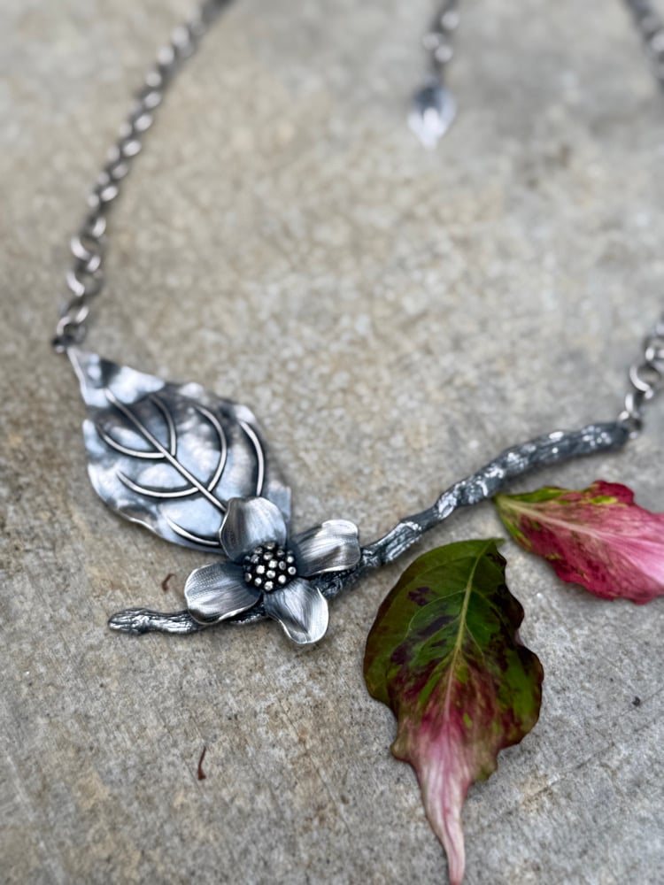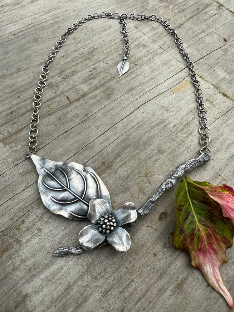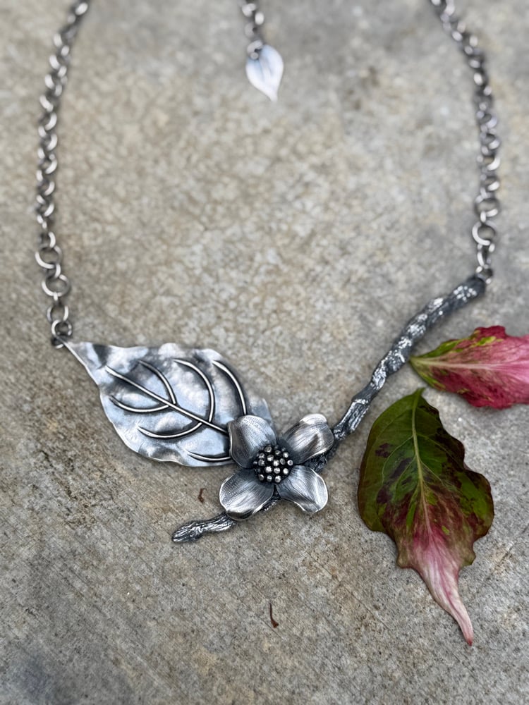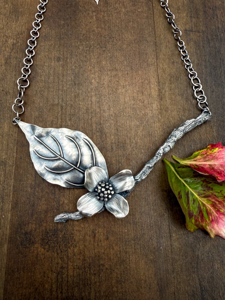 Enamored with this dogwood flower, which resembles the languid nature of its real counterpart. The leaf, which has been a vexing part of my dogwood pieces for years, turned out beautifully (and this is quite surprising in this heavy gauge silver!). The branch is fused metal, highly textured for impact.